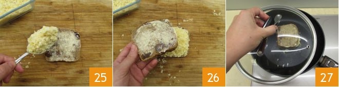 Auf die erste Brotscheibe mit der gebutterten Seite nach unten legen Sie den Käse 25, dann decken Sie ihn mit einer weiteren Brotscheibe ab, diesmal mit der gebutterten Seite nach oben 26. Erwärmen Sie eine beschichtete Pfanne und rösten Sie das Brot 2 Minuten lang, mit Deckel abdecken 27.