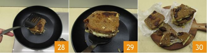 Nach der Zeit drücken Sie ein wenig und drehen es um, dann wiederholen Sie das Garen für die gleiche Zeit 28. Sobald der erste fertig ist 29, fahren Sie mit dem Braten der anderen Feigen- und Nusstoasts mit Bettelmatt fort und genießen Sie sie heiß und schmelzend 30.