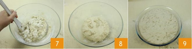 Rühren Sie weiter 7, bis Sie einen homogenen Teig erhalten 8. Decken Sie ihn dann mit Frischhaltefolie ab und lassen Sie ihn eine Stunde gehen, oder bis er sich verdoppelt hat 9.