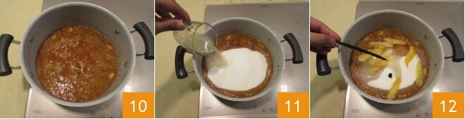 Sobald die Feigenmischung kocht 10, fügen Sie den Zucker, den Zitronensaft 11, die Schale, die Vanilleschote und ihre Samen hinzu 12.