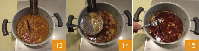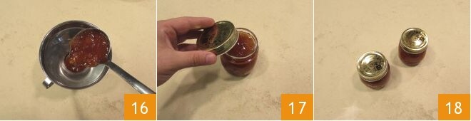 Rühren Sie alles um und kochen Sie weiter 13, bis die Konfitüre eine Temperatur von 104° erreicht (verwenden Sie ein Küchenthermometer, um die richtige Temperatur zu messen). Während dieser Zeit verwenden Sie einen Schaumlöffel, um den Schaum, der sich an der Oberfläche bildet, zu entfernen 14, um nach dem Abkühlen eine glänzende Kompote zu erhalten. Sobald die richtige Temperatur erreicht ist, nehmen Sie die Konfitüre vom Herd und entfernen Sie die Vanilleschote 15.