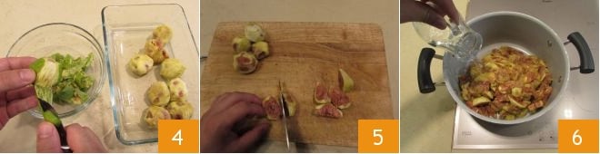 Waschen Sie Ihre Feigen vorsichtig und schälen Sie sie 4, schneiden Sie sie in vier Stücke 5 und legen Sie sie in einen großen Topf zusammen mit dem Wasser 6 und bringen Sie es zum Kochen.