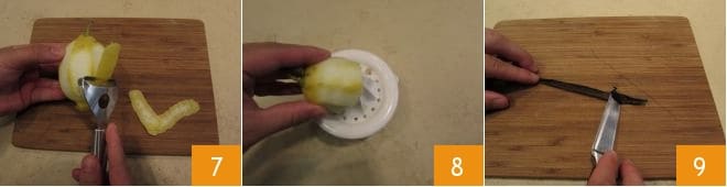 In der Zwischenzeit schälen Sie die Zitrone mit einem Sparschäler 7, bewahren Sie die Schale auf und pressen Sie den Saft aus, indem Sie ihn filtrieren 8. Schneiden Sie nun die Vanilleschote auf und schaben Sie die Samen mit einem scharfen Messer heraus 9.