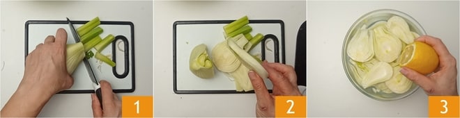 Um den Fenchel aus dem Ofen zuzubereiten, putzen Sie zunächst den Fenchel, indem Sie die Enden entfernen 1; Sie erhalten etwa 800 Gramm. Schneiden Sie ihn dann in 1 cm dicke Scheiben 2. Legen Sie sie nach und nach in eine Schüssel mit kaltem Wasser und dem Saft der Zitrone 3.