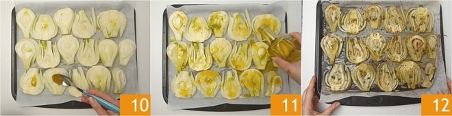 Lassen Sie den Fenchel abtropfen, tupfen Sie ihn mit einem sauberen Küchentuch trocken und legen Sie ihn ordentlich auf das Backblech. Bestreichen Sie den Fenchel mit der restlichen Emulsion 10, dann würzen Sie ihn mit 2 Esslöffeln Öl 11. Backen Sie im vorgeheizten Umluftofen bei 200° für 25 Minuten. Schalten Sie dann den Grill ein und backen Sie noch 5 Minuten weiter. Ihr Fenchel aus dem Ofen ist servierfertig 12!