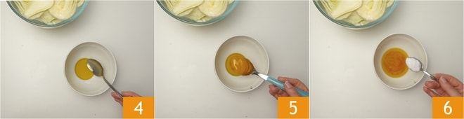 Bereiten Sie inzwischen die Emulsion vor: Gießen Sie das Öl 4, den Honig 5 und einen gestrichenen Teelöffel Salz 6 in eine kleine Schüssel.