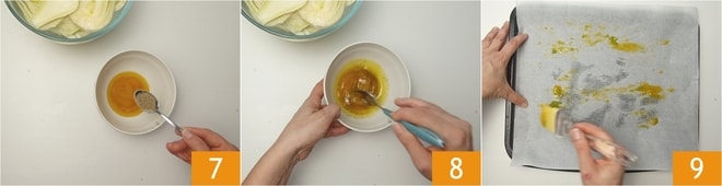 Fügen Sie den gemahlenen schwarzen Pfeffer 7 hinzu und mischen Sie energisch mit einem Löffel, um zu emulgieren 8. Legen Sie ein Backblech mit Backpapier aus und bestreichen Sie es leicht mit der frisch zubereiteten Emulsion 9.