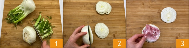 Um die Fenchel Cordon Bleu zuzubereiten, beginnt mit der Reinigung der Fenchel: Entfernt den grünen Teil 1 und schneidet sie quer, um 4 Paare von mehr oder weniger gleich dicken Scheiben zu erhalten 2. Schneidet auch den Edamer in gleichmäßige Scheiben. Legt eine Scheibe Schinken auf eine Fenchelscheibe 3.