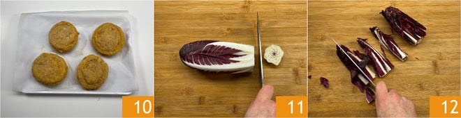 Formt es mit den Händen, damit es die Form behält, und legt das Cordon Bleu auf ein mit Backpapier ausgelegtes Tablett. Geht auf diese Weise vor, um alle weiteren zuzubereiten, mit diesen Mengen erhaltet ihr 4 10. Bereitet den Begleitsalat zu: Entfernt die ersten Blätter vom Radicchio und schneidet die Basis ab 11, dann halbieren und in so viele Spalten schneiden, wie ihr erzielen könnt 12.