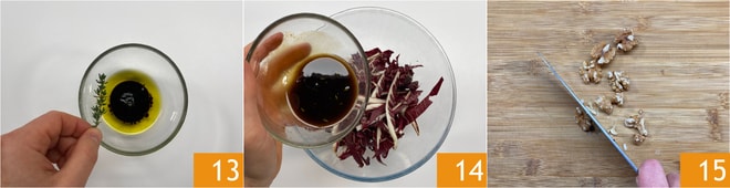 Bereitet eine Emulsion aus Öl, Balsamico-Essig, Thymianblättern, Salz und Pfeffer 13 vor. Würzt den Radicchio mit der Emulsion 14. Hackt die Walnüsse 15.
