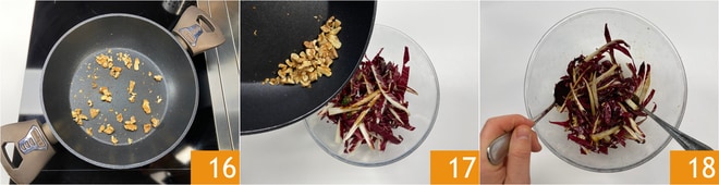 Röstet die Walnüsse in der Pfanne 16, fügt sie dann zum kleinen Salat hinzu 17 und mischt 18.