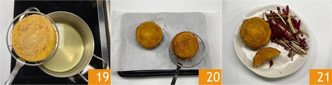 Bratet die Fenchel Cordon Bleu, maximal 2 auf einmal, in heißem Öl bei 170° 19. Nach ein paar Minuten werden sie goldbraun sein, dann abtropfen lassen 20 und mit dem Begleitsalat servieren 21!