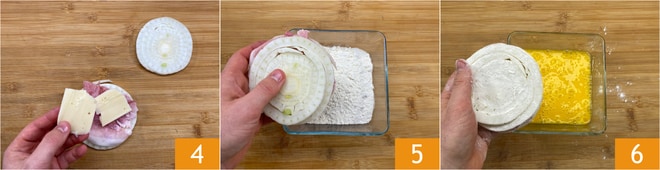 Fügt eine Schicht Käse hinzu 4 und schließt mit einer weiteren Fenchelscheibe. Taucht das Ganze zuerst in Mehl 5 und dann in die mit Milch verrührten Eier 6.