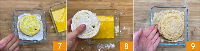 Wendet das Cordon Bleu noch einmal in Mehl 7 und den Eiern 8, und schließlich wälzt es im Paniermehl 9.
