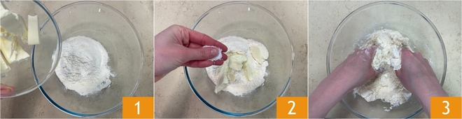 Um die Fenchel-Tatin zuzubereiten, beginnt ihr mit dem Mürbeteig: In eine Schüssel Mehl und kalte Butter geben 1, das Salz hinzufügen 2 und mit den Fingerspitzen so lange verreiben, bis eine sandige Konsistenz entsteht 3.