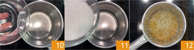 Weiter zum Karamell: In einen kleinen Topf Wasser 10 und Zucker 11 geben und bei mittlerer Hitze erwärmen 12.