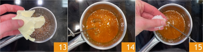 Wenn das Karamell eine bernsteinfarbene Farbe erreicht hat, die Butter zugeben 13 und kurz mit einem Schneebesen verrühren, gerade so lange, bis alles verbunden ist 14. Zum Schluss das Salz hinzugeben 15 und die Hitze abschalten.