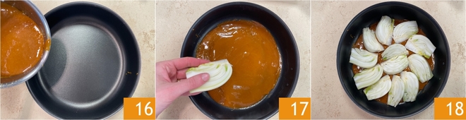 Jetzt eine antihaftbeschichtete Form mit 26 cm Durchmesser nehmen (besser, wenn sie leicht im Ofen vorgeheizt wurde) und das Karamell hineingießen 16. Es so verteilen, dass der Boden ganz bedeckt ist, dann die Fenchelspalten darauflegen 17, sodass ein Strahlenmuster entsteht 18.