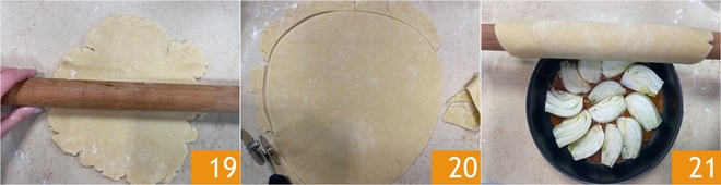Nun den Mürbeteig wiedernehmen und mit dem Nudelholz auf etwa 7 mm Dicke ausrollen, dabei etwas Mehl verwenden 19. Einen Kreis ausstechen, der etwas größer als die Form ist 20. Den Teig mit dem Nudelholz einrollen und über die Form abrollen 21.
