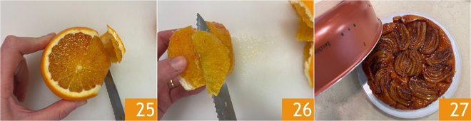 Nach der Backzeit aus dem Ofen nehmen und etwa zehn Minuten abkühlen lassen. In der Zwischenzeit die Orange filettieren: Die Schale mit einem kleinen Sägemesser entfernen 25 und die Filets herausschneiden, indem ihr das Fruchtfleisch zwischen zwei Häutchen einschneidet 26. Zum Schluss die Filets halbieren. Sobald die Tatin lauwarm ist, auf die Servierplatte stürzen 27.