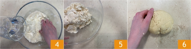 Das kalte Wasser dazugeben 4 und weiter mit den Händen kneten, zuerst in der Schüssel und dann auf der Arbeitsfläche 5. Wenn ein glatter, homogener Teigklumpen entstanden ist 6, in Frischhaltefolie wickeln und im Kühlschrank ruhen lassen, während ihr mit dem Rest des Rezepts weitermacht.