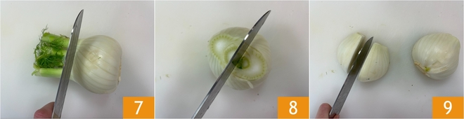 Kümmert euch um den Fenchel: die Enden entfernen 7, halbieren 8 und dann in Spalten schneiden 9. Beiseitestellen.
