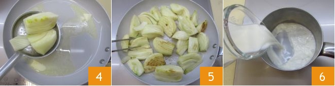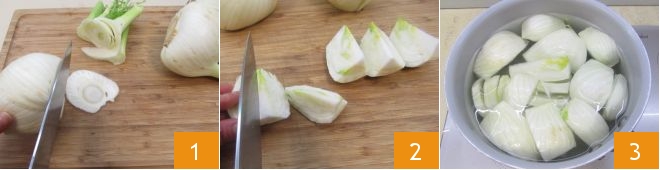 Um den Fenchel mit Béchamel zuzubereiten, zuerst den Fenchel putzen: Spitzen und Ansatz abschneiden 1. Die äußeren, zähen Blätter entfernen, halbieren und unter fließendem Wasser waschen, dann in relativ große Spalten schneiden 2. Den Fenchel in reichlich kochendes, gesalzenes Wasser geben 3 und 5–6 Minuten blanchieren.