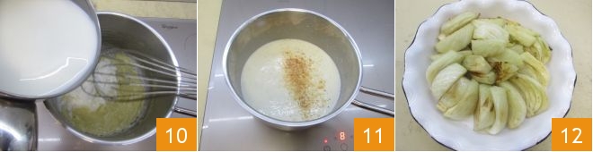 Jetzt die heiße Milch dazugeben 10 und weiter rühren, bis die Sauce eindickt. Zum Schluss salzen und mit Muskatnuss würzen 11. Den in der Pfanne gebräunten Fenchel nehmen und in eine Auflaufform mit 25 cm Durchmesser legen – oder eine Form, die groß genug ist, um ihn in einer einzigen Schicht aufzunehmen. Die Stücke fächerförmig vom äußeren Rand auslegen 12.