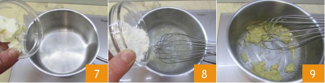 In einem anderen kleinen Topf 30 g Butter schmelzen 7, dann das gesiebte Mehl nach und nach einrieseln lassen 8 und dabei ständig mit einem Schneebesen rühren, damit keine Klumpen entstehen 9.