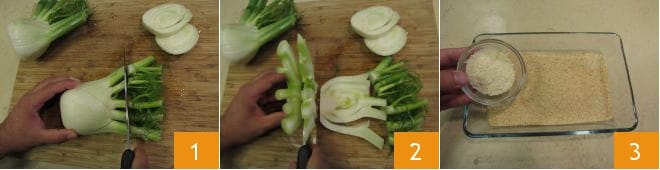 Um die Fenchelschnitzel zuzubereiten, waschen Sie sie zuerst gründlich unter fließendem Wasser. Entfernen Sie dann einen Großteil des Abschnitts mit den grünen Zweigen 1 und schneiden Sie den Fenchel längs in Scheiben 2. In der Zwischenzeit geben Sie die Semmelbrösel in eine Schüssel, fügen den Parmesan hinzu 3,