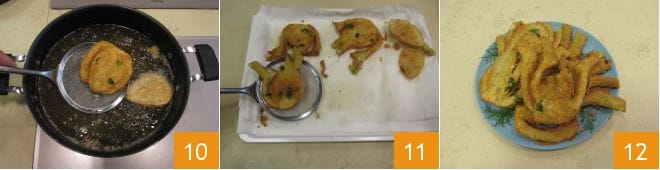 Nach 1-2 Minuten, wenn sie gut goldbraun sind, nehmen Sie sie heraus 10 und legen Sie sie auf ein Tablett mit Küchenpapier, um das überschüssige Öl zu entfernen 11. Sobald Sie mit dem Frittieren fertig sind, legen Sie sie auf einen Servierteller und servieren Sie die Fenchelschnitzel gut heiß 12.