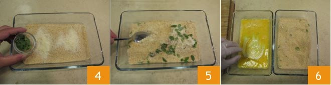 die frischen Oreganoblätter 4, Salz, Pfeffer und mischen Sie alles 5. In einer anderen Schüssel die Eier mit einer Prise Salz verquirlen. Zu diesem Zeitpunkt erhitzen Sie reichlich Öl, es sollte eine Temperatur von 170° erreichen. In der Zwischenzeit bereiten Sie die Schnitzel zu: Tauchen Sie die Fenchelscheiben zuerst in das Ei 6,