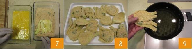 dann in die Semmelbrösel 7 und legen Sie sie nach und nach auf ein Tablett 8. Sobald das Öl die richtige Temperatur erreicht hat, frittieren Sie die Schnitzel 1-2 auf einmal 9.