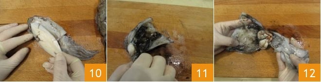 Nachdem ihr den Knochen entfernt habt 10, sucht vorsichtig den Tintenbeutel und, falls vorhanden, zieht ihn sehr vorsichtig heraus 11, indem ihr ihn mit den Fingern greift, aber nicht drückt, um ihn nicht zu zerbrechen und so das Auslaufen der Tinte zu vermeiden. Trennt dann den Kopf vom Körper des Tintenfisches 12, indem ihr den Körper mit einer Hand festhaltet und mit der anderen die Tentakel entfernt.