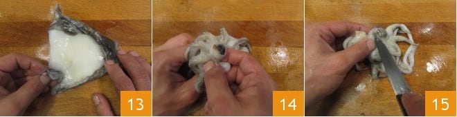 Entfernt dann die kleinen inneren Anhängsel 13; zieht die Haut ab, indem ihr einen kleinen Schnitt macht und sie mit den Händen abzieht. Entfernt den Schnabel, also den Zahn oder Schnabel, der sich in der Mitte der Tentakel befindet 14, indem ihr mit den Daumen unter Druck auf die Unterseite des Schnabels drückt, um ihn nach oben zu schieben. Entfernt mit einem kleinen Messer auch die Augen, indem ihr sie kreisförmig um den Augapfel schneidet 15, und dann herauszieht.