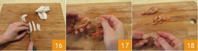Schneidet die kleinen Tintenfische schließlich in Streifen und stellt sie zur Seite 16. Fahrt dann mit der Reinigung der Garnelen fort: Entfernt den Kopf 17, den Panzer 18,
