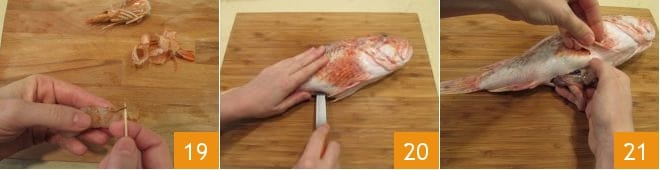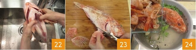 Spült ihn gründlich unter fließendem Wasser ab 22, entfernt dann die Flossen mit einer Schere 23; legt ihn in einen großen Topf zusammen mit einer Knoblauchzehe, Petersilie, Thymian und einigen Pfefferkörnern, dann bedeckt ihn mit Wasser (ca. 2,5 Liter) und lasst ihn bei schwacher Hitze zusammen mit den gereinigten Fischabfällen 24 kochen, um einen hervorragenden Fischfond zu erhalten.