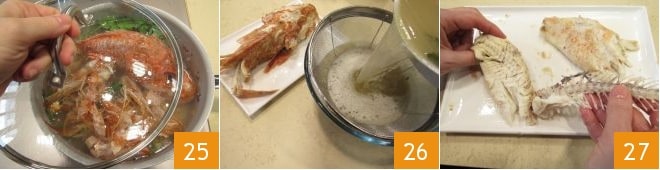 Deckt den Topf mit einem Deckel ab 25 und lasst ihn etwa 30 Minuten kochen. Nach dem Kochen nehmt den Drachenkopf intakt aus dem Wasser, lasst ihn abkühlen, filtert den erhaltenen Fond 26 und stellt ihn beiseite. Entgrätet dann den Fisch 27,