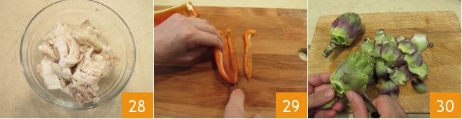 und stellt das Fleisch beiseite 28. Wascht die Paprika gründlich unter reichlich kaltem Wasser und trocknet sie mit Küchenpapier ab. Entfernt den oberen Teil, dann schneidet mit einem Messer die weißen Fasern und Samen im Inneren heraus; schneidet die Paprika in Streifen 29. Reinigt dann die Wie man Artischocken putzt: entfernt die äußeren harten Blätter 30, bis ihr zu den zarten gelangt;