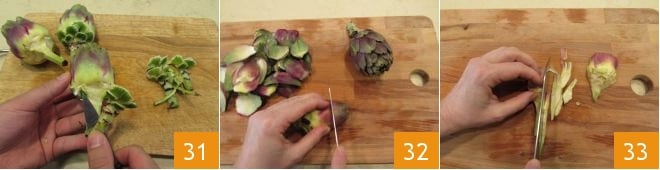 entfernt das hintere Ende (das der härteste Teil ist) und schneidet die eventuellen Dornen vom restlichen Stiel ab 31, dann entfernt die äußere faserige Schicht 32. Entfernt auch die innere Behaarung, also das „Heu“ der Artischocke, und schneidet die Herzen in Streifen 33.