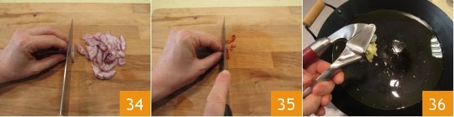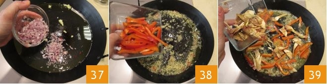 Fügt die gehackte Schalotte 37 und die Chilischote hinzu, lasst sie anschwitzen, dann fügt die Paprika 38, die Artischocken 39,