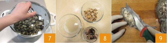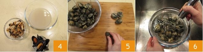 Sobald sie fertig sind, filtert das Wasser der Muscheln mit einem Sieb und stellt es beiseite, da ihr es für das Kochen der Pasta benötigt. Entfernt die Schalen 4 (denkt daran, ein paar unversehrt zu lassen, um sie dem Gericht zur Dekoration hinzuzufügen). Geht dann zu den Venusmuscheln über: Überprüft zunächst, dass sie keinen Sand enthalten, indem ihr sie einzeln auf ein Schneidebrett auf der Öffnungsseite klopft 5; sollte dunkler Sand austreten, sind die Venusmuscheln zu entsorgen. Dann legt sie in ein Sieb, das auf eine Schüssel gestellt wird, und spült sie mehrmals unter fließendem Wasser ab 6, bis in der Schüssel kein Sand mehr zu sehen ist.
