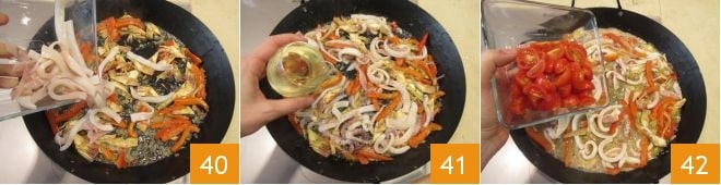 und die Tintenfische hinzu 40 und lasst sie kochen, bis die Paprika zart, aber noch intakt sind. Löscht mit dem Weißwein ab 41, fügt dann die Kirschtomaten hinzu 42, lasst sie weich werden, und salzt leicht.