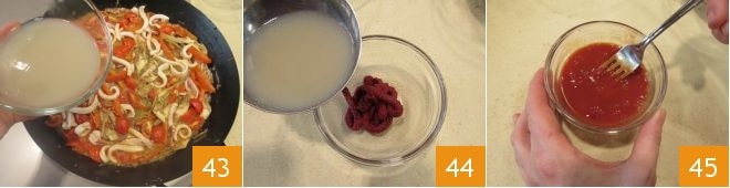 Fügt einen Teil des Fonds hinzu 43, dann verdünnt das Tomatenmark in etwas Fond und Flüssigkeit, die von den Muscheln und Venusmuscheln abgeseiht wurde 44, mischt 45 und stellt es beiseite.