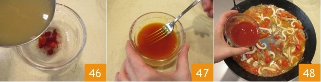 Verdünnt auch den Safran mit etwas Fond und Kochflüssigkeit der Fische 46, mischt 47 und stellt es beiseite. Fügt dann das verdünnte Tomatenmark hinzu 48,