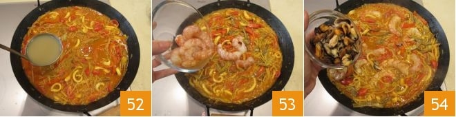 Bedeckt sie mit dem Fond 52 und kocht die Pasta wie ein Risotto, indem ihr nach Bedarf nach und nach Fond hinzufügt und häufig umrührt. Fünf Minuten vor Ende der Kochzeit der Spaghetti fügt die Garnelen hinzu 53, und nach zwei Minuten die Muscheln 54