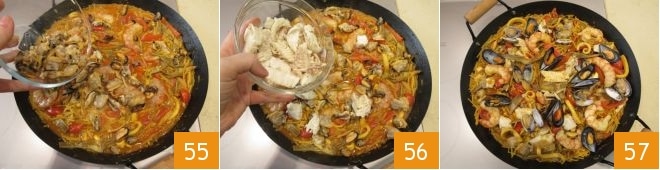 und die Venusmuscheln 55. Zum Schluss fügt das Fleisch des Drachenkopfes hinzu 56, schmeckt mit Salz ab, pfeffert und lasst die Kochflüssigkeiten eindicken. Wenn die Pasta al dente ist, schaltet die Hitze ab und serviert eure Fideuà, garniert mit den ganzen Muscheln, die ihr beiseite gelegt habt! 57 .