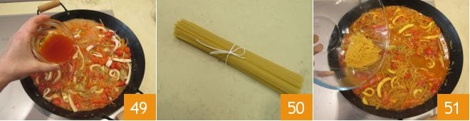 und den verdünnten Safran 49, dann wiegt die Spaghetti ab 50 und beginnt sie in einer Schüssel auf etwa 3 cm Länge zu brechen, und gebt sie in die Pfanne 51.