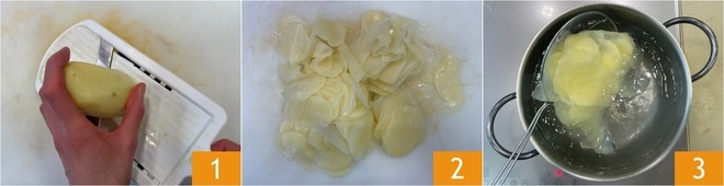 Um die gratinierten Wolfsbarschfilets vorzubereiten, setzen Sie zuerst einen Topf mit leicht gesalzenem Wasser auf. Schälen Sie in der Zwischenzeit die Kartoffeln und schneiden Sie diese mit einem Gemüsehobel in sehr dünne Scheiben 1 2. Die Kartoffelscheiben 5 Minuten lang blanchieren 3, dann abgießen und beiseite stellen.