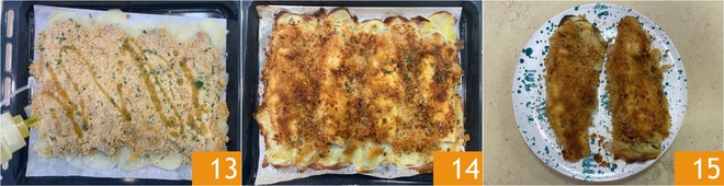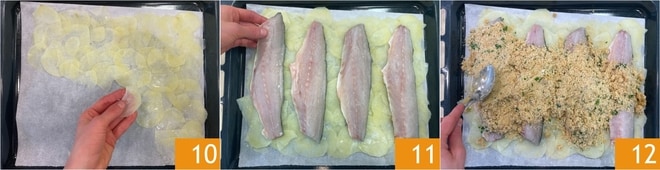 Legen Sie nun ein Backblech mit Backpapier aus und formen Sie eine Schicht aus leicht überlappenden Kartoffelscheiben 10, legen Sie dann die Wolfsbarschfilets mit der Hautseite nach unten darauf 11. Zum Schluss bedecken Sie den Fisch vollständig mit der Panade, indem Sie diese mit der Rückseite eines Löffels andrücken, damit sie haftet 12.